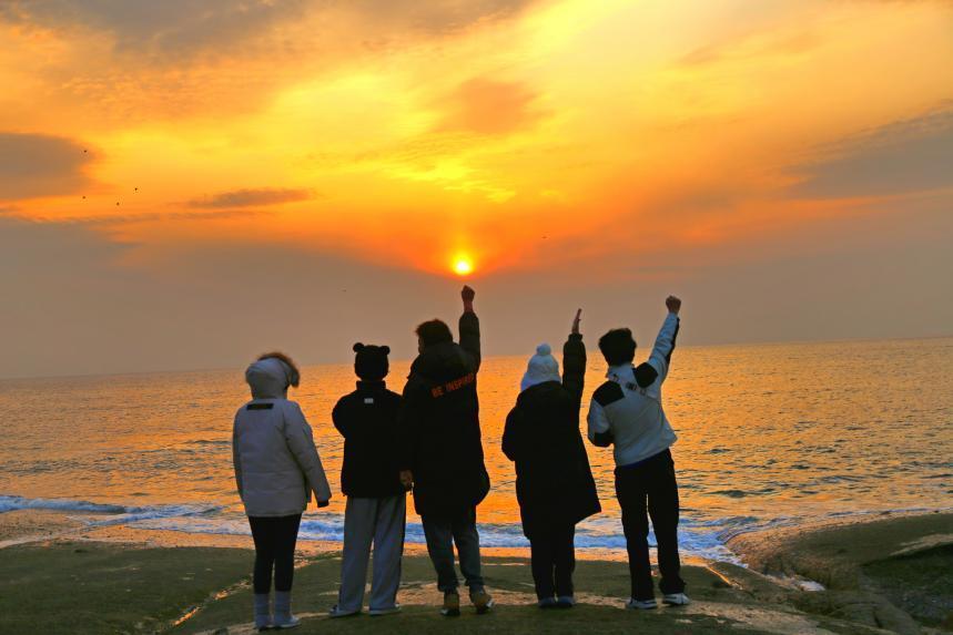三五好友相聚于海边,看远处红日渐渐升起。张守本 摄