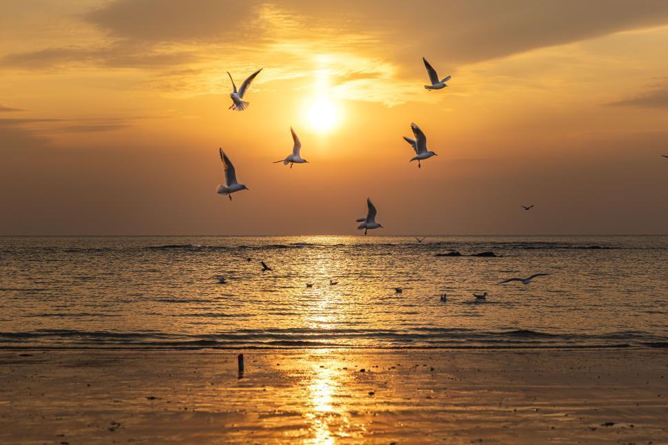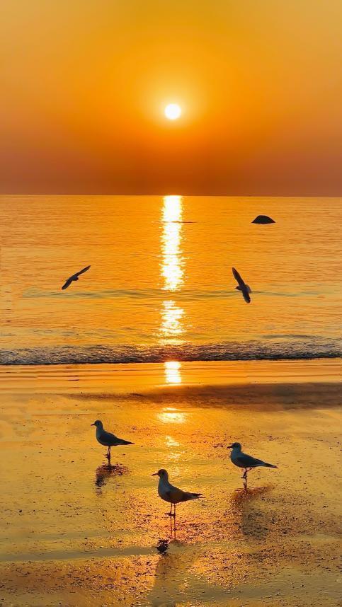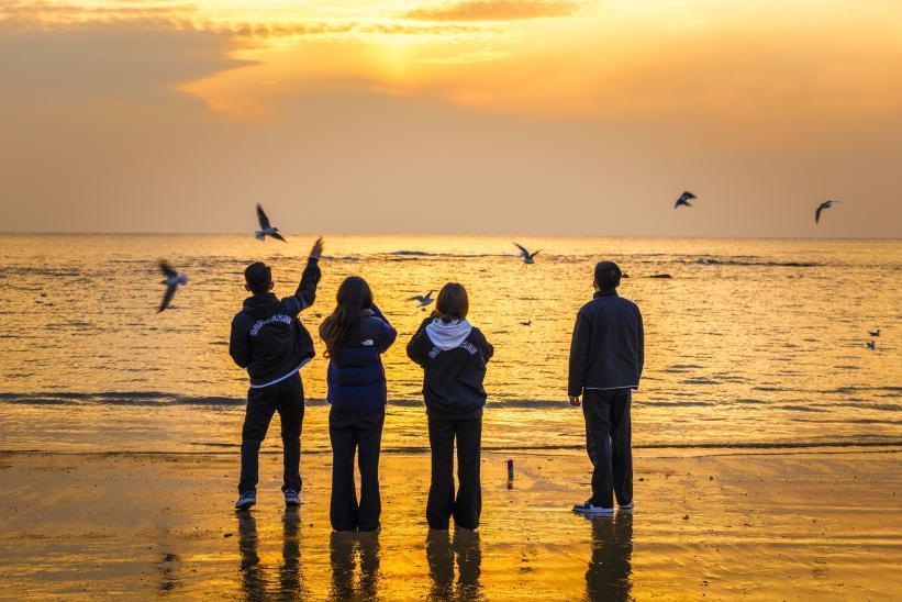 当金色的波浪轻轻拍打着沙滩,春季的风,像一双轻柔的手,轻拂过海面,泛起层层金波。游客们的身影在这片橙黄的世界里,构成了一幅幅生动的画面。而海鸥则像自由的使者,在天空中翱翔。游客们的欢声笑语,海鸥的清脆鸣叫,与海浪的低语交织在一起,编织出一曲美妙的海边交响乐。(刘晓楠)
